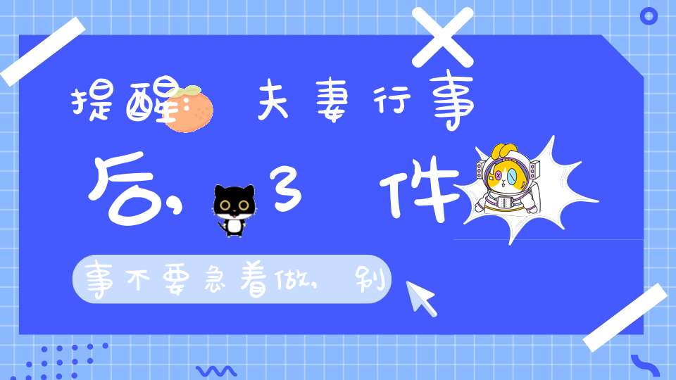 夫妻生活结束之后许多事情要注意,例如不要马上就去睡觉,因为刚刚完成夫妻生活,接受着性刺激,人的身体还处于兴奋状态,虽说有疲倦感,消耗了部分体力,但神经是兴奋的,大脑一直活跃,需要让大脑恢复平稳状态,神经兴奋性降低再去入眠,才能拥有高质量的睡眠获得好处。
