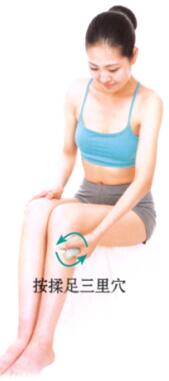 3、用平面按揉法重点刮拭三阴交穴、足三里穴、阴陵泉穴。