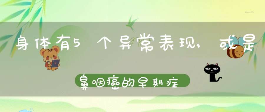 鼻咽癌是我国常见的一种恶性肿瘤,鼻咽癌发生自鼻咽黏膜的上层细胞,由于早期症状很容易跟其他疾病相混淆,造成鼻咽癌患者漏诊、误诊的情况发生。下面我们一起来了解下鼻咽癌早期的五大信号。 1、鼻塞:鼻塞是鼻咽癌另一个早期表现。大多表现为单侧鼻塞。当鼻咽肿瘤增大时,可能出现双侧鼻塞。 2、涕血:涕血是鼻咽癌的早期症状,表现为鼻涕中带血,或表现为从口中回吸出带血的鼻涕,又称为回吸性痰中带血。涕血常发生在早晨起床后。涕血量不多时,经常被患者疏忽,误认为是鼻炎或鼻窦炎,或被当作咯血到内科就诊。 3、耳鸣、听力减退:耳内闭塞感,鼻咽癌发生在鼻咽侧壁,侧窝或咽鼓管开口上唇时,肿瘤压迫咽鼓管可发生单侧性耳鸣或听力下降,还可发生卡他性中耳炎。单侧性耳鸣或听力减退,耳内闭塞感是早期鼻咽癌症状之一。 4、头痛:为常见早期鼻咽癌症状,占68.6%。可为首发症状或唯一症状,早期头痛部位不固定,间歇性,晚期则为持续性偏头痛,部位固定,究其原因,早期病人可能是神经血管反射引起,或是对三叉神经第一支末梢神经的刺激所致,晚期病人常是肿瘤破坏颅底,在颅内蔓延累及颅神经所猜销禅引起。 5、颈部淋巴结肿大:不少鼻咽癌患者往往是自己无意中在脖子上触摸到包块而就医。这种包块其实是肿大的淋巴结。鼻咽癌患者的颈部淋巴结肿大,常被误诊为炎症。对于经消炎治疗无缩小,甚至持续迅速增大的颈部肿穗尘块,尤其是质地较硬斗搏、活动度差、多个互相融合成团的无疼痛颈部肿块,需要及时就诊。 1、生活调理 患了鼻咽癌应避免体力上的过劳:如重体力劳动,熬夜,过度的体育锻炼等,均可使机体的内环境失衡,抵抗力下降,促使癌症复发或转移。治疗其间应注意局部卫生,每日数次漱口,必要时行鼻咽腔冲洗。一年内避免拔牙。 2、饮食调理 饮食宜均衡,多吃蔬菜、水果,少吃或不吃咸鱼、咸菜、熏肉、腊味等含有亚硝胺的食物,不宜辛燥刺激食品、不宜过量饮酒。尤其鼻咽癌放化疗期间的患者,常出现口燥咽干,食欲不振、恶心呕吐。中医认为此为气阴虚损、热毒炽盛,更应避免辛燥热毒刺激之品,饮食宜清淡,应选用容易消化、营养丰富、味道鲜美的食物。 3、常吃咸鱼易致鼻咽癌 据科学分析,烂咸鱼是一种直接引起癌症的食品,尤其容易导致鼻咽癌。中国南方各地十五至四十岁的人群中,患鼻咽癌者比较多。