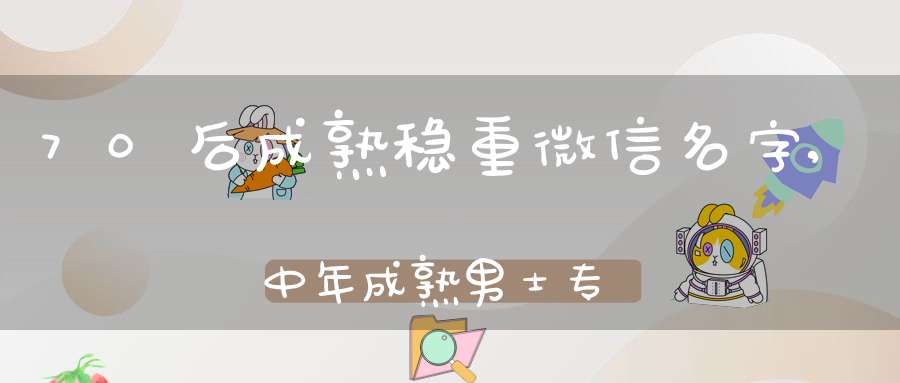 70后成熟稳重微信名字:漫步云端,理智去爱,泪眼迷离,浪荡不羁,酒里情话,久经风霜,骄傲不羁,白雪清风,白衣青衫,保持微笑,不要宣萱闹闹,春田花花,躲进怀里,泛黄照片,浮生若梦,改邪归我,高考加油,孤傲的狼,故事与你,寒烟似雪,荒废度过青春,中年成熟男士专用网名:搅碎一池星月,久宠不腻,没有你我更好,努力拼凑我的梦,情话说给傻子听,时间覆盖一切,痛过之后方醒悟,星光下的寂寞,醒醒吧别傻了,一路向北,一挽青丝,用笑宣泄悲伤,知世故而不世故,栀子树下的等。