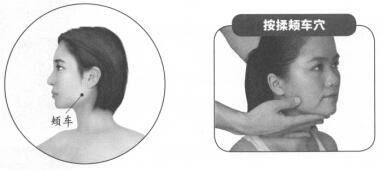 按摩方法:按摩者用双手轻轻托住被按摩者下领,用双手拇指按压两侧颊车穴1分钟,顺时针按揉约1分钟,然后逆时针按揉约1分钟。