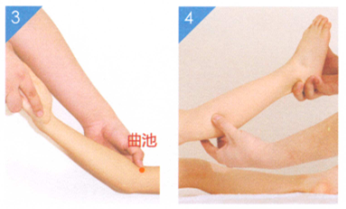 2、按揉曲池、足三里穴各1分钟(图3、图4)。